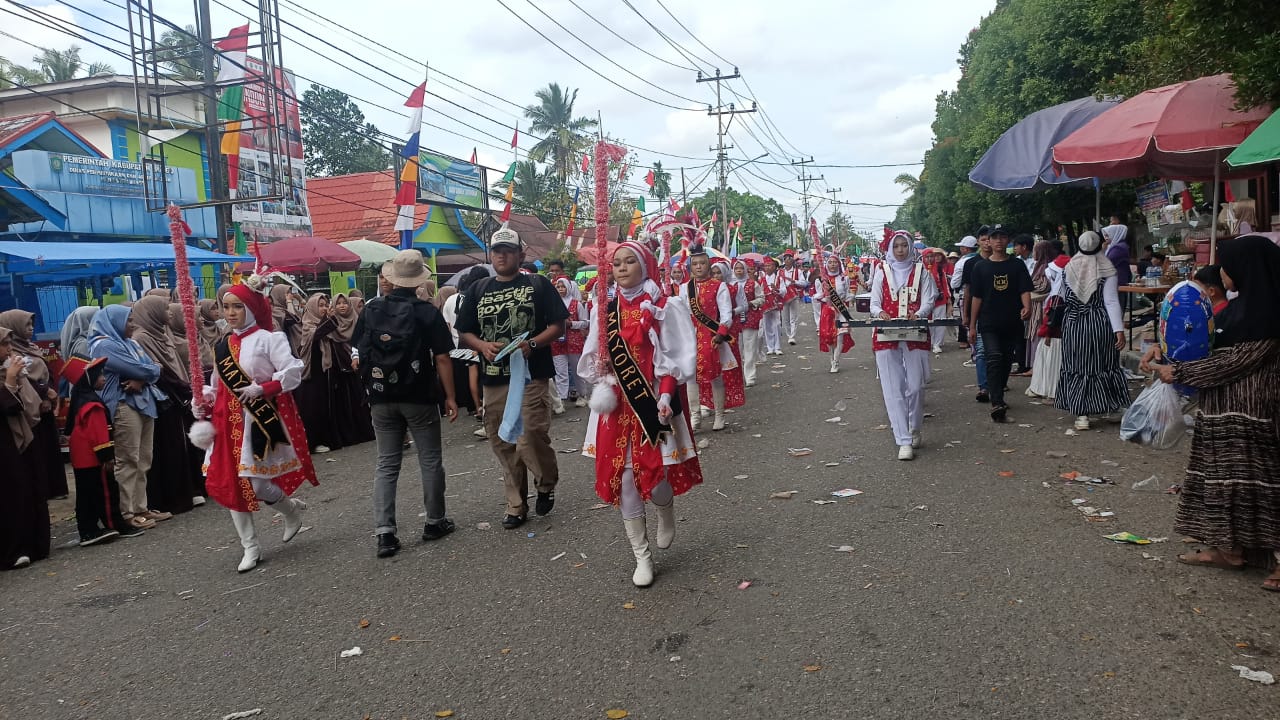 Drum Band Bahana Nada Dramanda tampil memukau dalam pawai pembangunan memperingati HUT Kemerdekaan Republik Indonesia ke-80 yang diselenggarakan oleh Pemerintah Daerah Kabupaten Bungo Senin (18/08/2025).
