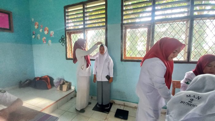 Bungo_ Dalam rangka meningkatkan kesadaran pentingnya menjaga kesehatan di kalangan pelajar, UPT Puskesmas Muara Bungo II melaksanakan kegiatan pemeriksaan kesehatan gratis di MAN 2 Bungo pada hari ini Selasa 21 Oktober 2025. Kegiatan ini diikuti antusias oleh siswa kelas X.