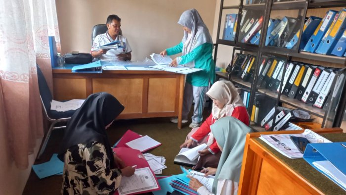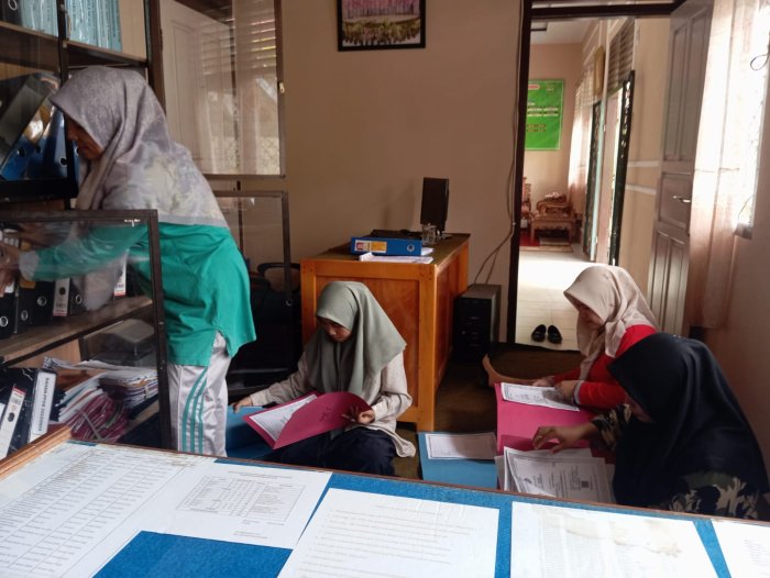 Staf TU terlihat bekerja dengan penuh kehati-hatian, mulai dari pengecekan arsip, penyusunan data laporan program madrasah, hingga penyiapan dokumen pendukung lainnya. Suasana kerja tampak serius namun tetap kondusif, mencerminkan komitmen untuk memberikan hasil terbaik pada proses penilaian nantinya.