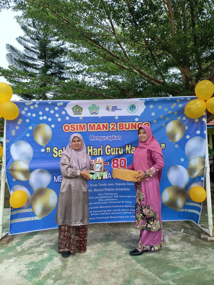 Suasana penuh canda, tawa, dan kehangatan tampak mewarnai lapangan MAN 2 Bungo saat seluruh dewan guru melaksanakan kegiatan tukar kado dalam rangka memperingati Hari Guru Nasional (HGN) ke-80. Acara sederhana namun sarat makna ini menjadi wadah untuk mempererat hubungan sesama guru serta menambah semangat kebersamaan di lingkungan madrasah.