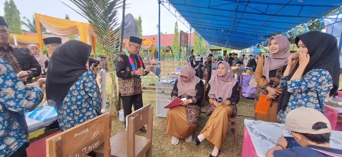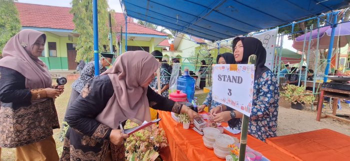 Ketua Komite MAN 2 Bungo mengapresiasi kreativitas siswa dalam menata stand bazar.
