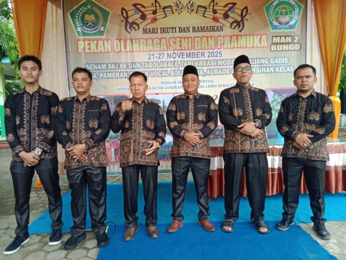 Suasana penuh kekompakan terlihat di lingkungan MAN 2 Bungo saat pelaksanaan Pekan Olahraga dan Seni Antar Kelas (PORSEKA). Dalam kegiatan tahunan tersebut, Kepala MAN 2 Bungo, didampingi Kaur Tata Usaha, para guru, serta seluruh staf, tampil seragam mengenakan pakaian khusus yang telah ditetapkan panitia.