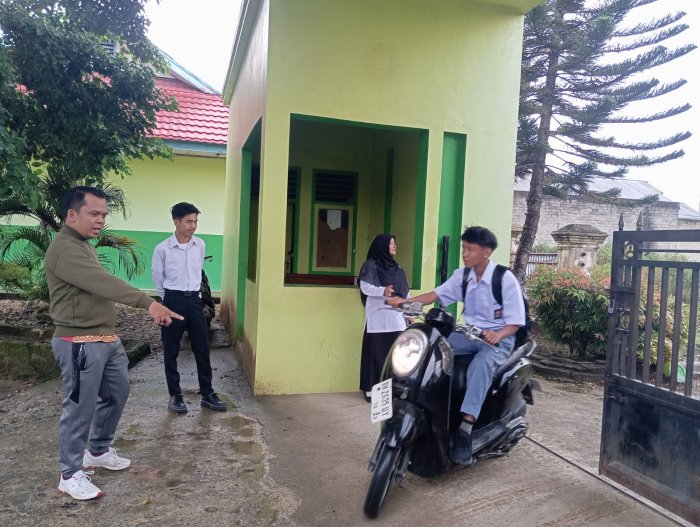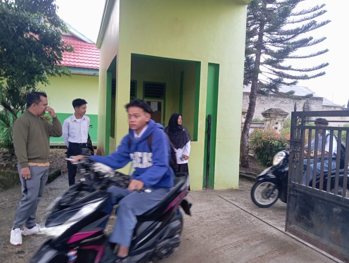 Guru piket MAN 2 Bungo melaksanakan tugas penyambutan kedatangan siswa pada Senin pagi (02/02/2026) sebagai bagian dari pembiasaan disiplin dan penanaman karakter positif di lingkungan madrasah.