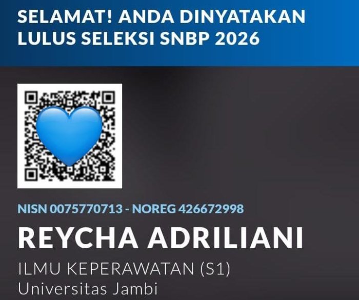 "Saya sangat bersyukur dan tidak menyangka bisa lolos SNBP di pilihan jurusan Ilmu Keperawatan Universitas Jambi. Ini menjadi langkah awal untuk meraih cita-cita saya di bidang kesehatan," ujarnya.