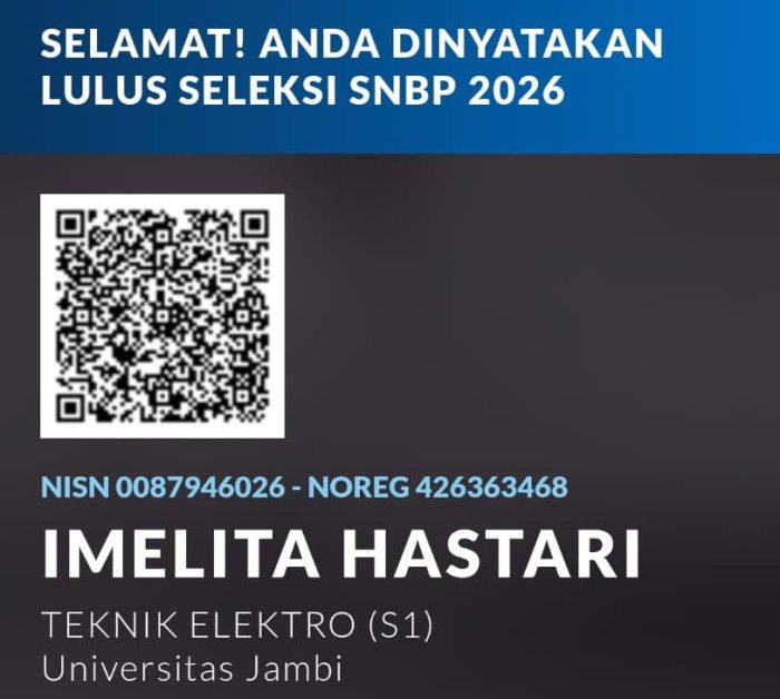 Prestasi membanggakan kembali diraih oleh pelajar daerah. Imelita Hastari berhasil lulus melalui jalur Seleksi Nasional Berdasarkan Prestasi (SNBP) tahun 2026 dan diterima di Program Studi Teknik Elektro (S1) Universitas Jambi.