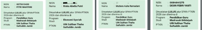 Kabar membanggakan datang dari Madrasah Aliyah Negeri (MAN) 2 Bungo. Sebanyak empat siswa terbaik berhasil lulus Seleksi Prestasi Akademik Nasional Perguruan Tinggi Keagamaan Islam Negeri (SPAN-PTKIN) tahun 2026 pada jurusan Pendidikan Guru Madrasah Ibtidaiyah (PGMI).